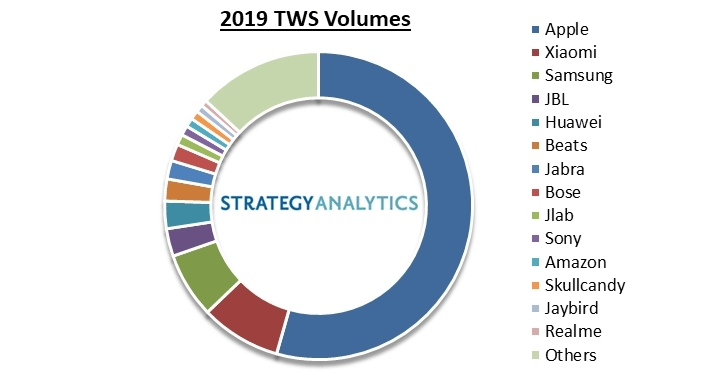 Strategy Analytic公司的数据显示,苹果公司是TWS竞争中的最大参与者(真无线立体声耳塞,简称“ TWS”)。